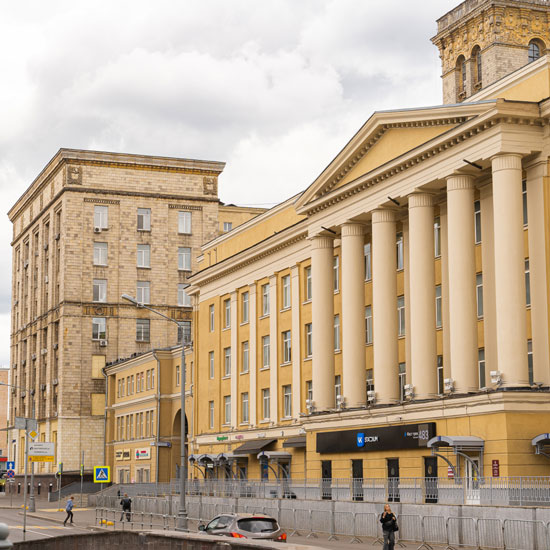 Удобное расположение. Наш культурно-деловой квартал на Ленинградском проспекте, д. 80, находится в шаговой доступности от метро «Сокол». Он легко узнаваем, его «визитная карточка» – величественные здания эпохи сталинского ампира. На машине от центра до нас можно добраться за 15-20 минут.